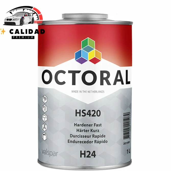 El H24 HS420 Hardener Fast (1L) es el endurecedor acrílico de elección para acelerar el proceso de repintado en condiciones climáticas templadas  o cuando se utiliza un secado forzado en cabina. Ofrece un tiempo de curado más rápido que el endurecedor medio (H25), lo que mejora la productividad y permite un pulido más temprano, sin la prisa extrema del endurecedor «Very Fast» (H23). Está diseñado para usarse con capas transparentes (Clearcoats) y barnices HS420 compatibles.